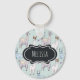 Cadena de llaves personalizada con un lindo patrón de llamas caprichosas. Uno está tumbado, uno tiene una flor en la boca, y uno te está mirando con recelo. Estos animales tienen mucho encanto. Se coloca sobre un fondo verde de puntos de polka. En la parte superior hay un marco elegante vintage en blanco y negro con tu texto en el interior.
