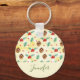 Cadena de llaves con un lindo patrón de pinos y un hueco sobre un fondo acuático amarillo con pequeños círculos blancos esparcidos por ahí.