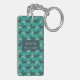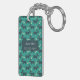Una cadena de teclas acrílicas diseñada con un patrón de repetición que presenta una adorable garganta sonriente con orejas disquetas y un hueso de perro. Fondo verde. Personalice su nombre en la parte delantera y su nombre y número de teléfono en la parte posterior.