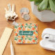 Un llavero con un ambiente retro. Un patrón compuesto de naranjas en rodajas, naranjas enteros, hojas verdes y flores blancas.