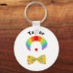 Crea tu propia cadena de claves de payaso personalizada. Presenta un ilustracion de un payaso con una peluca de color arcoiris, nariz de payaso roja y corbata de un punto polka amarillo y está listo para ser personalizado con un nombre u otro texto personalizado. Hace un gran favor para fiestas de cumpleaños con temática de payaso.