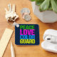 Un lindo regalo de colorguard para alguien que lleva una bandera girando con la banda de marchas en la escuela. Peace Love Color Guard está escrito en verde bonito, rosa caliente, azul y amarillo neón.