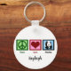 Un oso panda adorable en una plaza azul junto a una señal de paz verde y un corazón rojo en una hermosa cadena de claves animal. Me encantan los pandas lindos.