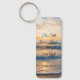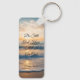 Keychain con el amanecer sobre el océano y "Quédate quieto y sé que soy Dios Salmos 46:10" escrito en él. Generación de IA.