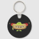 Perro caliente el hombre está hecho con un abrigo frito en un bollo caliente fresco, con una cabeza y zapatos de alivio verde, y una sonrisa de "IMA HOT DOG".