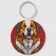 Ilustracion colorido y artístico de un perro de San Bernardo, con un fondo vibrante con un mosaico circular rojo. La expresión del perro es feliz, mostrando su piel prominente y sus rasgos faciales.