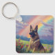 Una cadena de claves conmemorativas del Pastor Alemán personalizada con una pintura de un feliz Pastor Alemán en una serena colina paradisíaca con un hermoso arco iris sobre el fondo. Simbolizar al Pastor Alemán ha pasado el puente arcoiris al cielo doggy. Personalízalo con el nombre de su propio perro pastor alemán o cualquier otro texto en el reverso de la cadena de claves. Hace un maravilloso regalo conmemorativo para cualquier amante del Pastor Alemán.