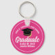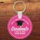 Esta linda cadena de chicas de graduación de personalizado blanco y rosado presenta su nombre de instituto o universidad para la clase de 2025. Personalizar con su nombre de graduado y año bajo el audaz guión manuscrito y el gorro de grado para un regalo de la cadena de claves de grad personalizado.