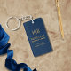 Teclas duraderas y elegantes con el logotipo de su monograma de oro de personalizable de su empresa, en un elegante patrón de cuadrados azul marino. Un producto promocional práctico y elegante para empleados, clientes o equipo de eventos.
