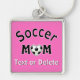 Llavero personalizado de la mamá del fútbol, corazón del fútbol, fondo y texto en sus colores y texto o cancelación. Usted, o diseñador Linda: 239-949-9090, puede cambiar los COLORES DE FONDO rosados y blancos o de texto a cualquier color. Grandes regalos para las mamáes del fútbol, regalos de la mamá del equipo de fútbol para ella. El diseñador Linda puede cambiar a la mamá del fútbol que los regalos diseñan a sus colores del equipo o a sus colores del favorito.