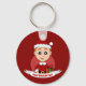 Cadena de llaves con el ilustracion de un lindo sonriente y feliz muchacho de cabello jengibre, lleva disfraz rojo y blanco de Santa Claus y tiene un regalo; con plantilla de texto editable para tu nombre o mensaje, Navidades diseño de vacaciones con fondo rojo