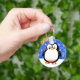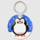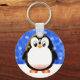Un lindo dibujo de pingüino rosa. Cadenas de claves para animales bebés. Fondo de color azul. La nieve brilla en el fondo. Una idea de regalo para los niños.