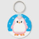 Un lindo dibujo de pingüino rosa. Cadenas de claves para animales bebés. La nieve brilla en el fondo. Una idea de regalo para los niños.