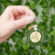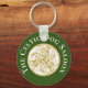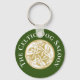 Keychain con texto de personalizable y centro intrincados perros celtas de oro y blanco con diseño en forma de disco sobre fondo verde.