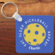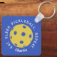 La cadena de claves personalizado Eat Sleep Repeat Pickleball presenta un fondo azul con una bola de picnic amarilla en el centro de la cadena de claves con el dicho "come el sueño, repite el pickleball envuelto alrededor de la bola. Personalízalo con su nombre o iniciales en una fuente de script. Un gran regalo para un entrenador o aficionado al pickleball.