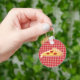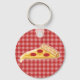 Ilustracion personalizado dulce de una rebanada grasienta de pizza con tres trozos de salami y mucho queso encima. El color de fondo es rojo con un patrón de manchas blancas.