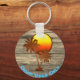 Esta cadena de claves de verano presenta un mensaje relajado, el texto del personalizable dice "Buenas vibraciones solamente en la impresión azul claro. El diseño está decorado con una puesta de sol naranja y siluetas de palmeras marrones sobre un fondo de madera falsa que recuerda a un antiguo muelle de madera de la playa. Esta cadena de claves es totalmente personalizable. Puede editar el texto, la fuente, el color de la fuente y la forma. Simplemente pulse el botón Personalizar para editar el texto, o el botón Personalizar para hacer cualquier cambio de tipo de letra o color, y hágalo propio. Hace un gran regalo, un artículo de fiesta o un momento de verano. Ideal para los amantes de la playa, el océano, el verano, los diseños retro, y las vibraciones suaves y buenas. Este diseño también está disponible en pegatinas y otros artículos.