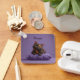 Un lindo personalizado negro y naranja tortoisesinfierno gatito se sienta cómodamente sobre un cojín morado contra un fondo morado.