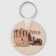 Petra es una increíble ciudad tallada en las montañas de arenisca roja de Jordania en el Medio Oriente. El antiguo monasterio ha servido como tumba Nabataen y iglesia bizantina. En esta imagen, un burro, adornado con coloridas mantas, se para mirando la asombrosa estructura arquitectónica. ¡Este diseño es un gran recuerdo de viaje! Este llavero es completamente personalizable.