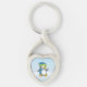 Un pequeño pingüino personalizado con gorra y bufanda caminando sobre la nieve.