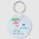 Cadena de claves personalizada con un nombre, número inicial y número de teléfono. Diseñado con el ilustracion de una mami y un flamenco rosado de bebé sobre una cama de flores suculentas florales con palmeras verdes que se balancean por la espalda. Tropical y bonito. El fondo es una acuarela azul veraniego con toques de violeta.