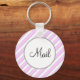 A keychain for your mailbox, office or house key with script letters on the front, and vintage letters on the back, all on a background of pink stripes in light pink, dark pink and white.