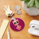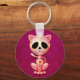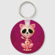 El gatito rosa es adorable y está decorado con motivos de remolinos y puntos. Los pedales de flores rodean los ojos puros negros en la tradición del Día de los Cachorros de azúcar Muertos. El gato está sentado, mirando hacia adelante con la cola ondeando en el fondo. La cabeza sobredimensionada se sienta sobre un pequeño cuerpo que crea una apariencia juguetona y personalizado. Una estrella de cinco puntos se sienta en medio de la frente del gatito, mientras que un corazón rojo brillante y amarillo aparece en el centro del pecho. Una sombra cae sobre el fondo rosado vibrante que hace que el diseño parezca flotar justo por encima de la superficie de esta cadena de claves. Este lindo gato es un diseño divertido y elegante inspirado en los hermosos patrones de los cráneos del azúcar del Día de los Muertos.