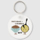 Un llavero con un ilustracion de un tazón de granos de pinto y una sartén de hierro de pan de maíz con caras. El texto dice, "Granos de Pinto + Pan de Corne".