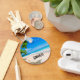 Un llavero con una hermosa fotografía. Una playa de arena blanca y agua azul cielo. Una imagen relajante con un cielo soleado y un suave surf de espuma con algunas bonitas hojas tropicales enmarcando la imagen.