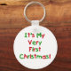 El texto de estilo infantil rojo y verde dice "¡Es mi primera Navidad!" de vacaciones en bolsos de té, trajes para el cuerpo y camisetas para los bebés que están celebrando su primera Navidad.