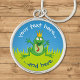 Dibujo animado del Príncipe Rana con corona sobre hierba verde bajo cielo azul. Dos campos de texto personalizados en círculo.