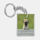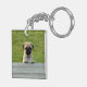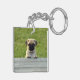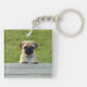Adorable portrait photograph of a pug puppy peeping over a picnic table.