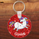 Un pequeño unicornio dulce sobre una cadena de llaves (o llavero) saltando por el aire sobre un mar de purpurina rojo. Ella tiene una forma de arco iris, cola y cuerno para emparejar, con brillantes cascos dorados. El nombre personalizado se puede cambiar muy fácilmente en las opciones - o se puede eliminar por completo si es necesario. Este anillo de claves unicornio sería perfecto para un regalo de amante de unicornio, o incluso hacer grandes favores para una fiesta de cumpleaños de una niña con un tema unicornio.