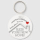 Una cadena de claves de 2.25" presenta un corazón rojo sobre el techo de una nueva casa, las palabras "¡Bendita tu nueva casa!" junto con el nombre de tu empresa, el número de teléfono y el nombre del agente. CAMBIAR EL COLOR DE FONDO a cualquier cosa - mostramos azul claro. Personalice este regalo de marketing de negocios con su propia información para felicitar a los compradores por su nueva casa. COINCIDIENDO elementos de nuestra colección.
