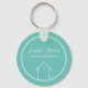 Esta cadena de claves verde azulada del agente inmobiliario es personalizado hecho con el nombre de su compañía de propiedades bajo el nombre del agente en la tipografía de moda. Esta cadena de claves de la empresa inmobiliaria minimalista cuenta con un sencillo dibujo de una casa. Regalo contemporáneo para un agente que trabaja para ayudarle a comprar una casa.