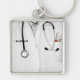 Cadena de teclas única para médicos que incluye una bata de laboratorio con temática médica, estetoscopio y graciosa imagen de cuchillo del ejército suizo. Para que el personalizar edite el texto para agregar el nombre de su médico favorito o personalizar de otro modo.