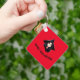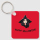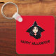 La parte delantera del keychain muestra el retrato de una bruja joven con el pelo largo negro y un gorra puntiagudo negro sobre un fondo rojo, junto con las palabras "¡Feliz Halloween!". La cadena de claves se puede personalizar fácilmente.