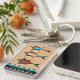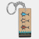 Este fob de doble cara muestra 2 variaciones de IconDoEs un diseño moderno fresco de Retro, cada una con 3 peces personalizados, diseñado para reflejar la influencia del diseño atómico y aeronáutico, nadando por encima de la sugerencia de olas azules sobre rayas negras en una superficie natural de madera de cerezo + 2 campos de texto personalizado para el nombre o leyenda del destinatario. Inspirados por los caricaturistas y artistas gráficos de la 'era atómica' de la Segunda Guerra Mundial.