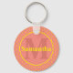 Cadena de teclas rosa con pequeños puntos de polka amarillos. Dos plantillas dentro de un círculo rosado una para agregar su inicial y la otra para agregar su nombre a personalizar.