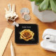 Una detallada rosa dorada rodeada de bordes radiantes, situada sobre un fondo negro profundo. Atmósfera elegante y lujosa ideal para diseños decorativos, románticos o de celebración.