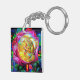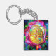 Una fascinante pintura digital de un rosa reventando con energía psicodélica y tonos arcoiris. Los pétalos rosados vivos se envuelven alrededor de un núcleo dorado brillante, creando una pieza central floral surrealista.