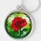 La rosa roja vibrante está centrada dentro de un marco negro ornamentado, colocada sobre un fondo borroso verde suave, creando un contraste llamativo que resalta la belleza de la flor.