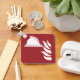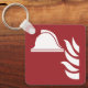 Casco de lucha contra incendios e icono de llama sobre fondo rojo. Texto personalizado en la parte posterior.