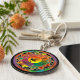 Rótulo Zodiac Sagittarius Mandala Keychain. Mandala de color naranja, verde y arcoiris con los símbolos astrológicos para el signo zodiaco Sagittarius el Arquero. Símbolos del planeta gobernante Júpiter, el elemento del fuego y el símbolo Caduceus del sanador