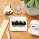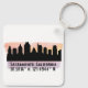 La elegante cadena de claves cuadrada presenta la silueta de líneas horizontales de Sacramento, CA con coordenadas de mapa en un fondo salpicado de color agua.