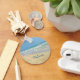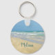 Personalizado y hermosa cadena de claves de playa personalizada en la arena con tu nombre en una tipografía verde azulada bonito bajo el lindo sandpiper parado en el borde de las olas verdes azules del océano. Este lindo regalo de chica de playa te recuerda la felicidad del verano.