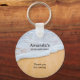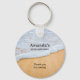 Un keychain con una fotografía de una playa de arena dorada marrón con olas blancas.