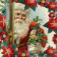 Vintage illustration of Santa Claus bringing gifts and presents for Christmas, decorated with holly berries and poinsettias.