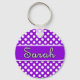 Corta cadena de teclas con pequeños puntos blancos sobre fondo morado con el nombre de Sarah impreso en ella.