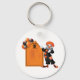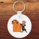 Este diseño es un payaso aterrador. El payaso está vestido de negro y naranja y señala una pantalla aterradora. Este espeluznante diseño de payasos se ve muy bien en esta Keychain